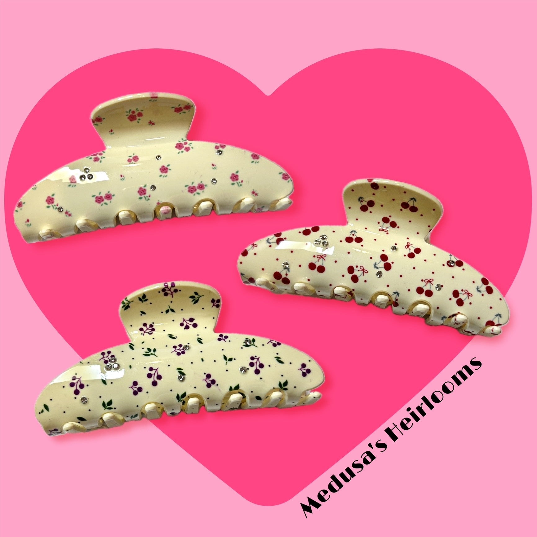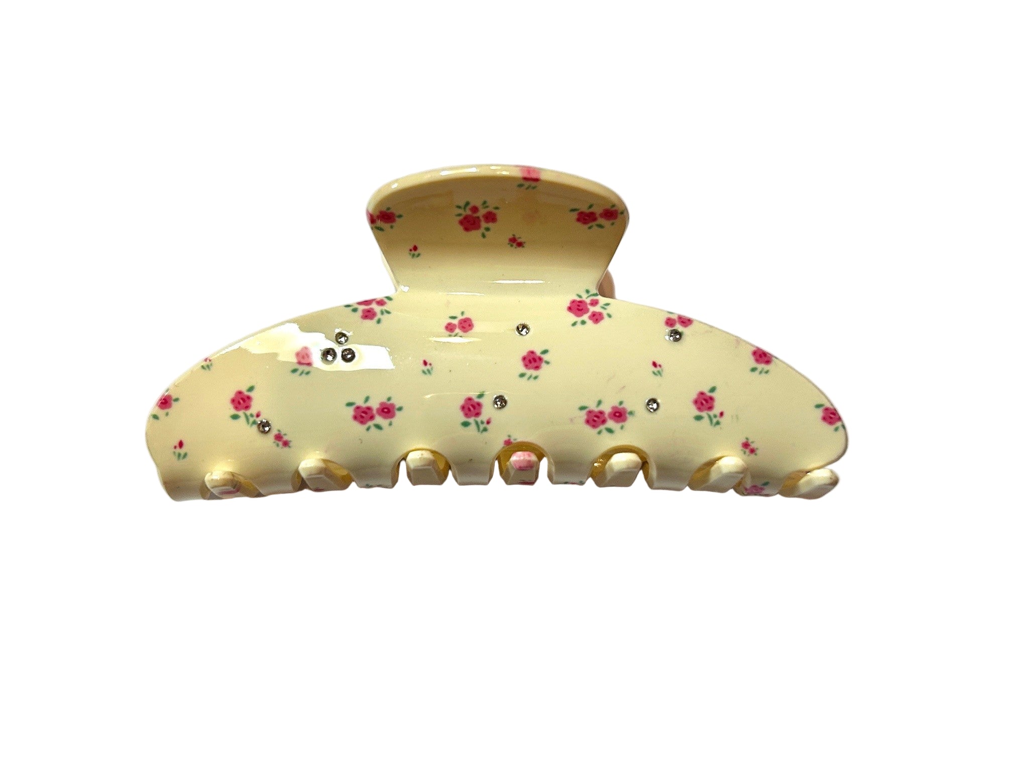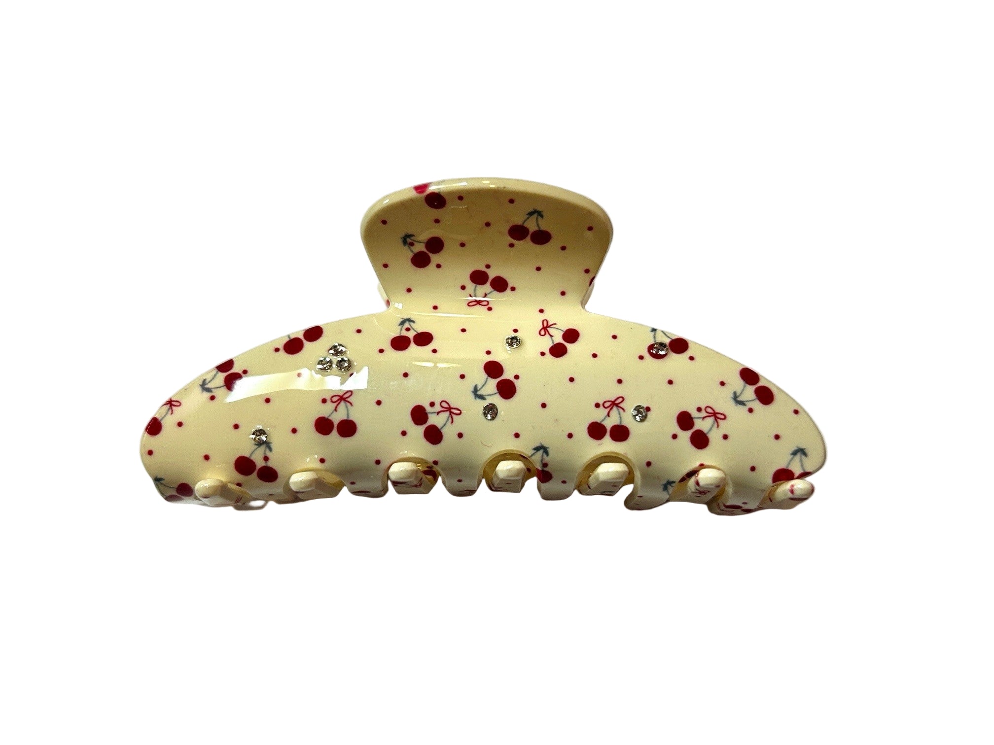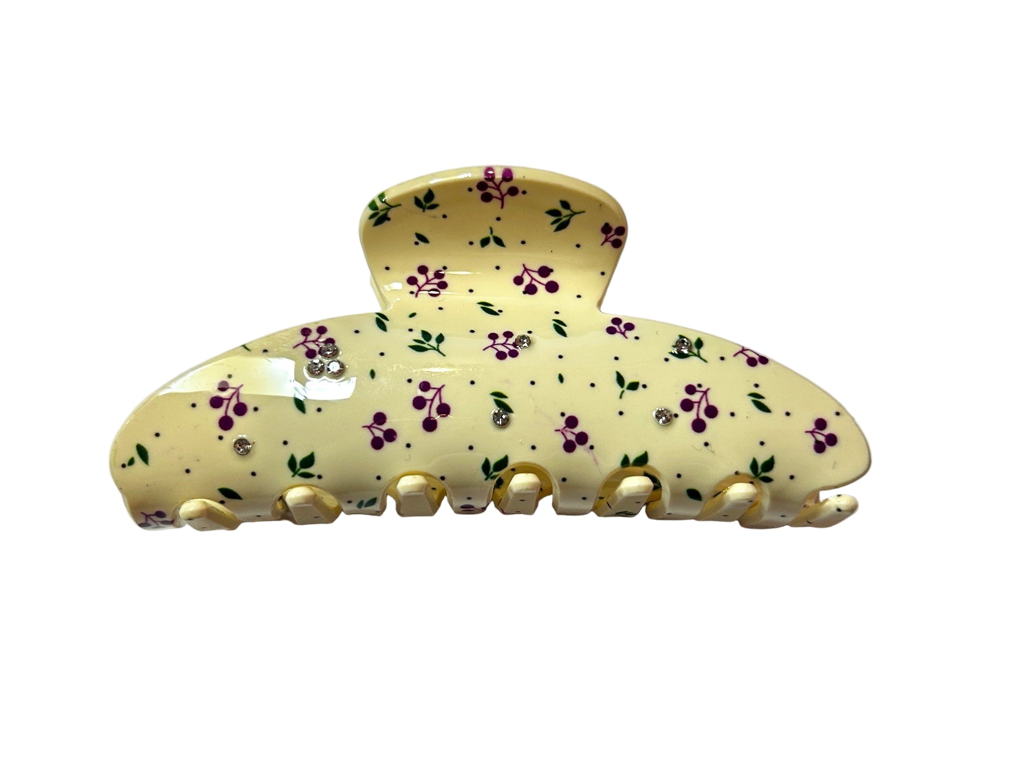 Embrace your delicate femininity with our new lovely French Jaws! These Jaws feature a coquette pattern of fruits/flowers on an Ivory background with inlaid rhinestones scattered throughout.
